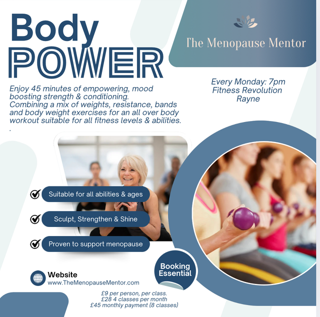 Attend my Body Power and Body Harmony classes. Ladies only, tailored exercise classes to support peri and menopausal bodies, building strength, flexibility and targeting stubborn areas